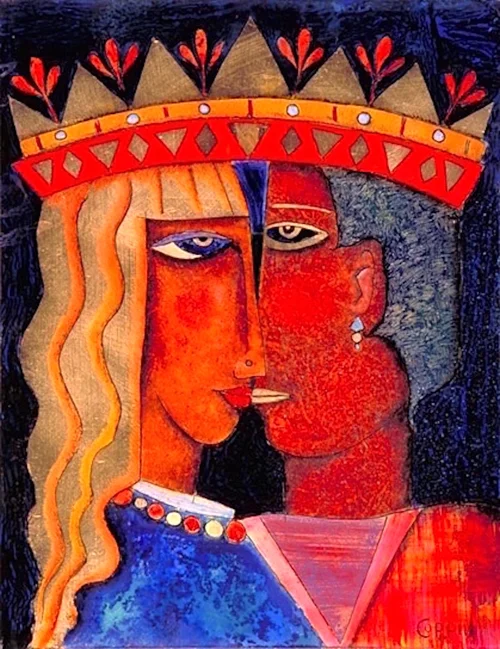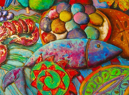 Michèle Coppin's mixed media paintings are painted on glass, in reverse and backed with gold, silver or copper leaf. Inspired by time, gardens, fabrics and folklore, the subjects emerge from tangles of natural elements woven into color fields and threaded with decorative detail.